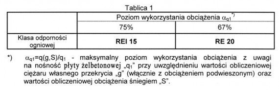 Klasyfikacje w zakresie odporności ogniowej przekrycia dachu wykonanego z części nośnej w postaci płyty żelbetonowej z izolacją termiczną z płyt styropianowych (system dachowy nr 66) przy poziomie wykorzystania dopuszczalnego obciążenia podłoża według kryteriów polskiej normy PN-EN 13501-2:2007(U) podano w tablicy nr 1.