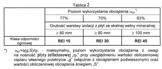 Klasyfikacje w zakresie odporności ogniowej przekrycia dachu wykonanego z części nośnej w postaci płyty żelbetonowej z izolacją termiczną z płyt ze skalnej wełny mineralnej (system dachowy nr 65) przy poziomie wykorzystania dopuszczalnego obciążenia podłoża według kryteriów polskiej normy PN-EN 13501-2:2007(U) podano w tablicy nr 2.