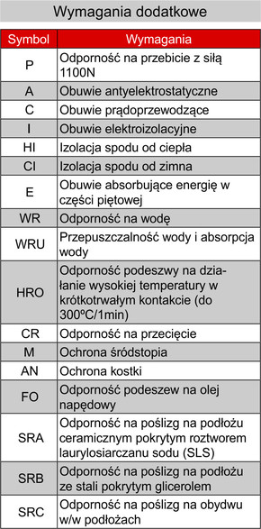 Normy określają podstawowe wymagania dla obuwia będącego ochroną indywidualną, a także określają system kategorii i właściwości obuwia. Ich graficzną wizualizacją są symbole umieszczone na wyrobach. Przykładowo: SB, S1do S5 – obuwie bezpieczne (wyposażone w podnosek), OB, O1-O5 – obuwie zawodowe (bez podnoska). Oprócz podstawowej kategorii na etykietach można także znaleźć informacje o tym, że dany model obuwia spełnia tzw. wymagania dodatkowe. Jeśli zatem na etykiecie odnajdziemy zapis: S1 SRA oznaczać to będzie, że dany model buta należy do grupy obuwia bezpiecznego (spełnia wymagania normy EN ISO 20345), posiada podnosek, podeszwa jest odporna na olej napędowy oraz ma właściwości antyelektrostatyczne, część piętowa podeszwy absorbuje energię (amortyzuje w czasie chodzenia), jest także zabudowana. Natomiast oznaczenie SRA informuje, że dany model spełnia tzw. wymagania dodatkowe, a w tym przypadku jest to odporność na poślizg na podłożu pokrytym glicerolem.